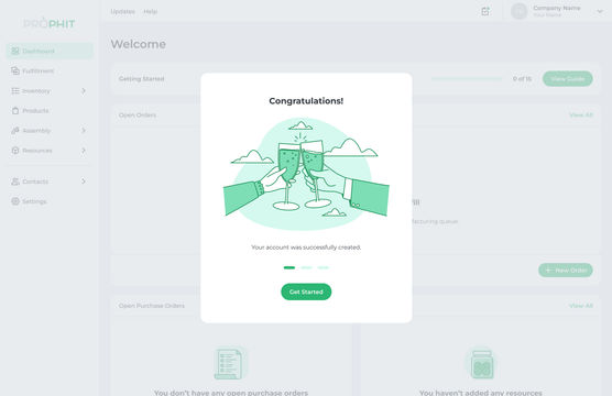 Thinking about the onboarding journey, I wanted to drive the user to their 'aha' moment as soon as possible. My intention was to forgo additional prompts and form fields in order to move the user from account creation to their dashboard, where they would be greeted with the 'Getting Started' flow. This flow would inspire confidence as each user would know the next-best action. Although pertinent, required information like business and information would appear post first-time-experience.